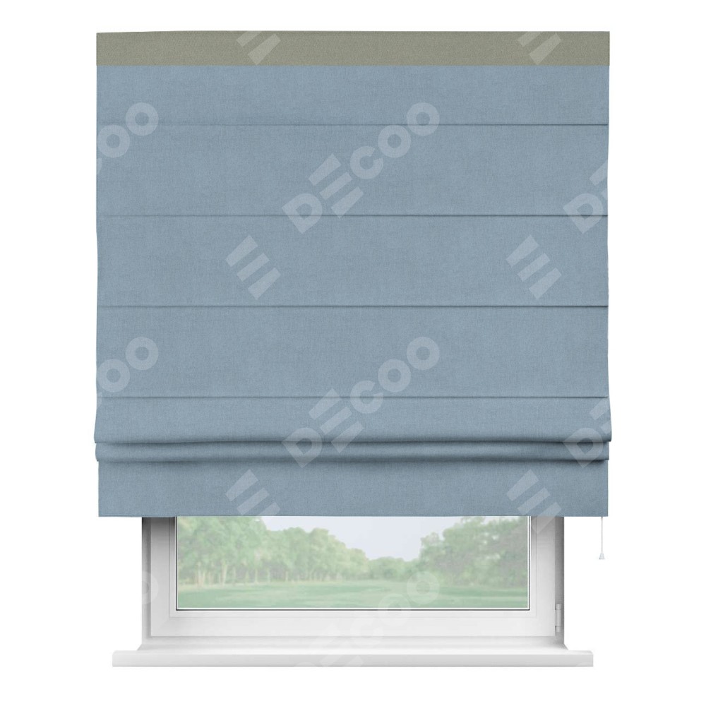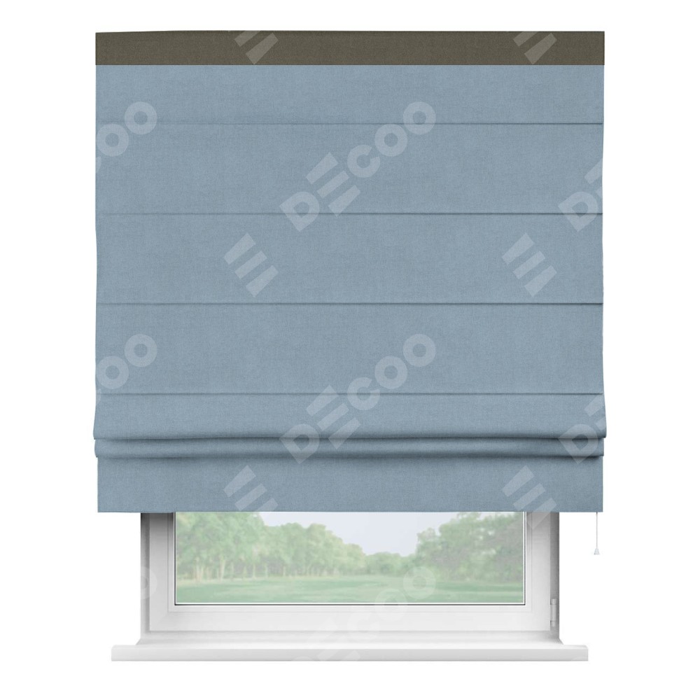Римская штора производителя «Cortin», используется для проёма, пошита из ткани лён блэкаут голубой, артикул 69574. Отделка шторы кантом «Кинг», ткань для канта используется из льна разной расцветки на выбор. Имеет универсальный механизм и подходит для монтажа: на потолок, на стену и в нишу.