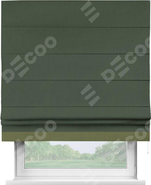 Римская штора производителя «Cortin», используется для проёма, пошита из ткани лён блэкаут зелёный, артикул 69497. Отделка шторы кантом «Джестер», ткань для канта используется из льна разной расцветки на выбор. Имеет универсальный механизм и подходит для монтажа: на потолок, на стену и в нишу.