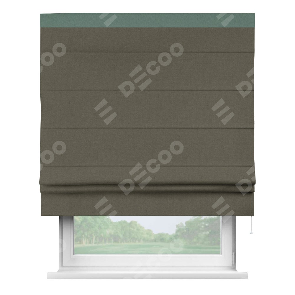 Римская штора производителя «Cortin», используется для проёма, пошита из ткани лён блэкаут коричневый, артикул 69383. Отделка шторы кантом «Кинг», ткань для канта используется из льна разной расцветки на выбор. Имеет универсальный механизм и подходит для монтажа: на потолок, на стену и в нишу.