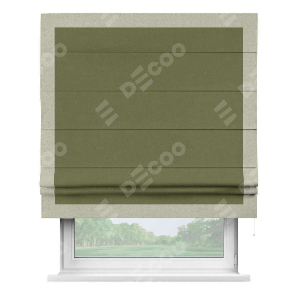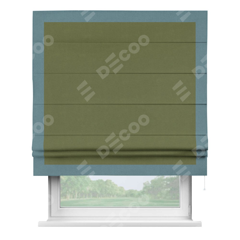 Римская штора производителя «Cortin», используется для проёма, пошита из ткани лён блэкаут оливковый, артикул 69516. Отделка шторы кантом «Чесс», ткань для канта используется из льна разной расцветки на выбор. Имеет универсальный механизм и подходит для монтажа: на потолок, на стену и в нишу.