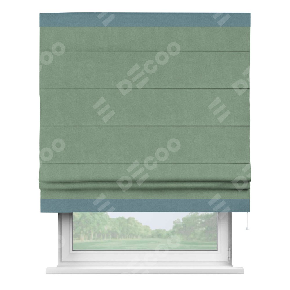 Римская штора производителя «Cortin», используется для проёма, пошита из ткани лён блэкаут светло-бирюзовый, артикул 69443. Отделка шторы кантом «Горизонт», ткань для канта используется из льна разной расцветки на выбор. Имеет универсальный механизм и подходит для монтажа: на потолок, на стену и в нишу.