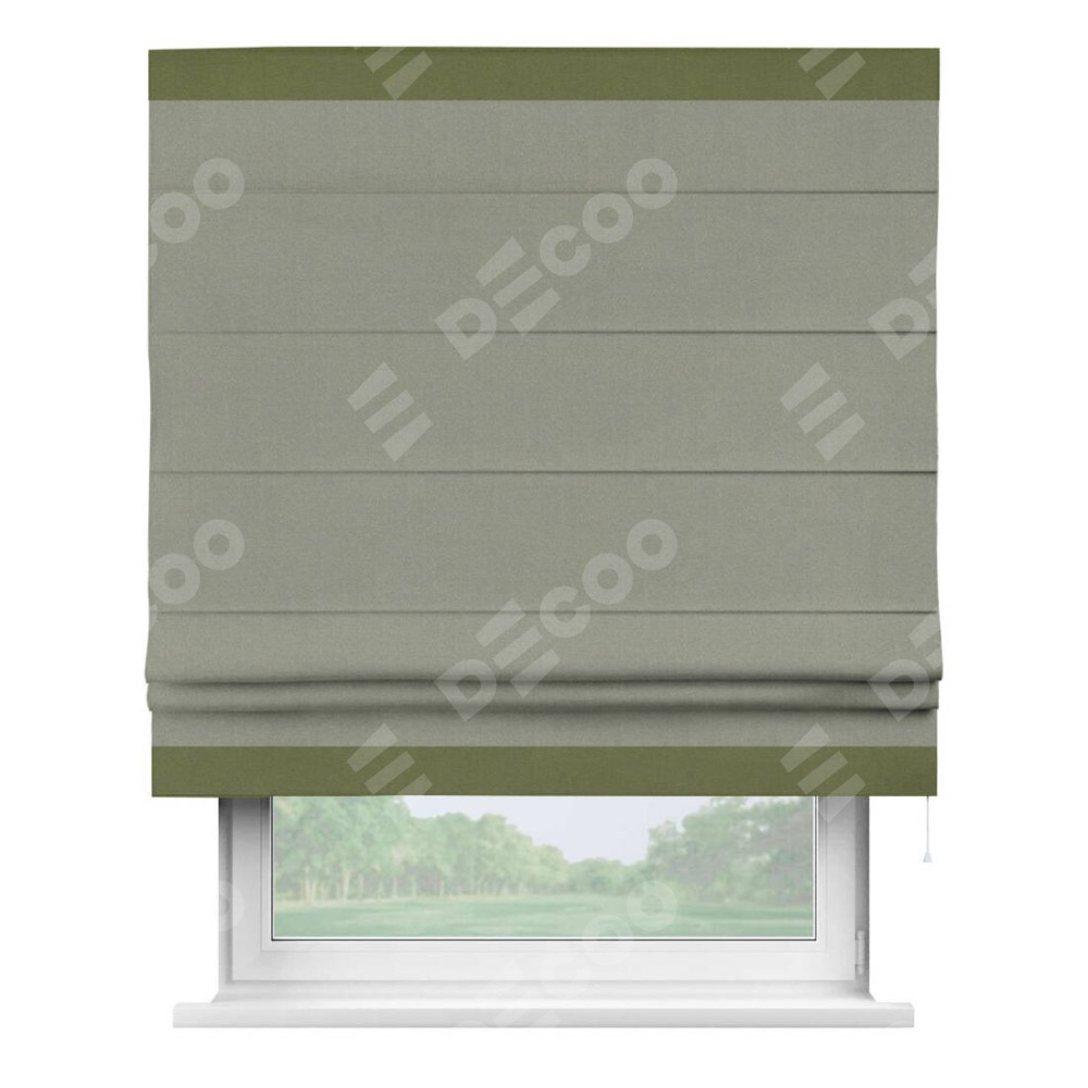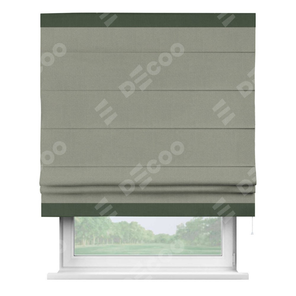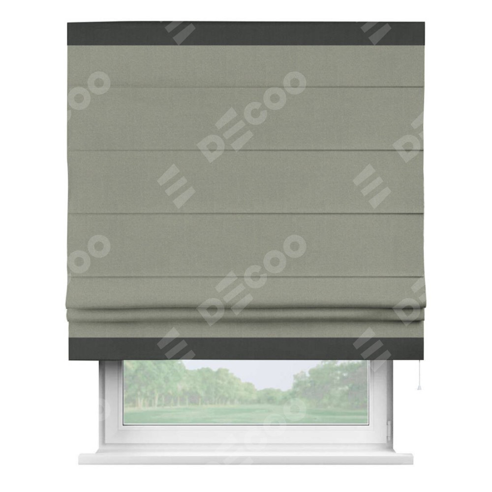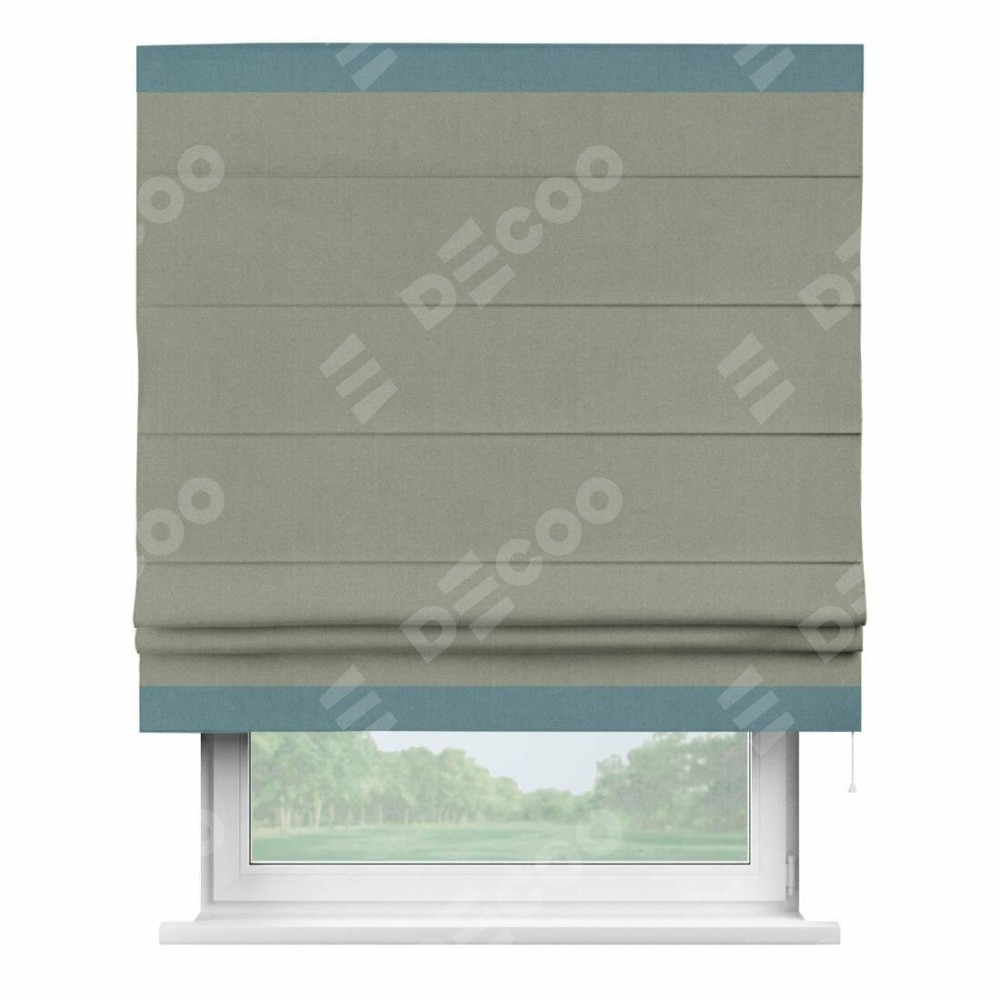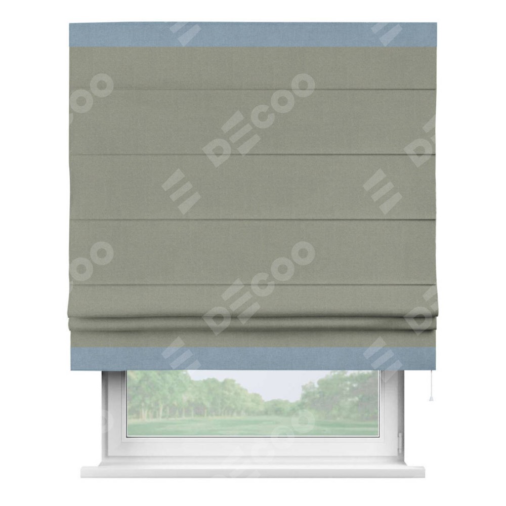 Римская штора производителя «Cortin», используется для проёма, пошита из ткани лён блэкаут светло-серый, артикул 69446. Отделка шторы кантом «Горизонт», ткань для канта используется из льна разной расцветки на выбор. Имеет универсальный механизм и подходит для монтажа: на потолок, на стену и в нишу.
