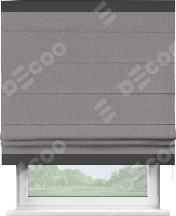 Римская штора производителя «Cortin», используется для проёма, пошита из ткани лён блэкаут сиреневый, артикул 69576. Отделка шторы кантом «Горизонт», ткань для канта используется из льна разной расцветки на выбор. Имеет универсальный механизм и подходит для монтажа: на потолок, на стену и в нишу.
