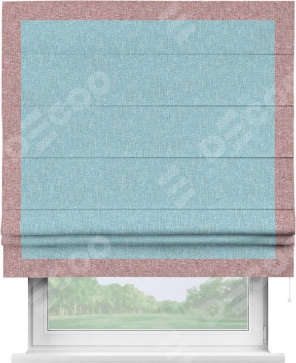 Римская штора производителя «Cortin», используется для проёма, пошита из ткани лён кашемир голубой, артикул 21616. Отделка шторы кантом «Чесс», ткань для канта используется из льна разной расцветки на выбор. Имеет универсальный механизм и подходит для монтажа: на потолок, на стену и в нишу.