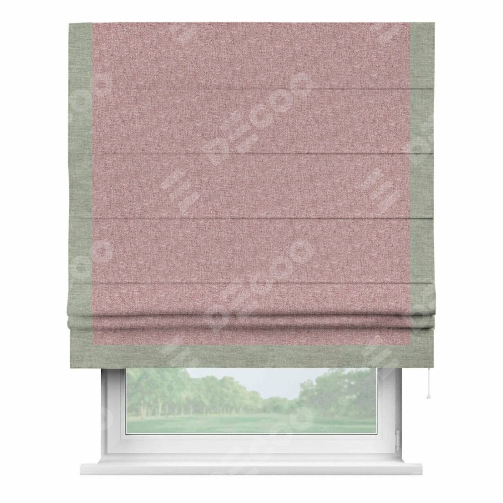 Римская штора производителя «Cortin», используется для проёма, пошита из ткани лён кашемир розовая пудра, артикул 21619. Отделка шторы кантом «Виктория», ткань для канта используется из льна разной расцветки на выбор. Имеет универсальный механизм и подходит для монтажа: на потолок, на стену и в нишу.