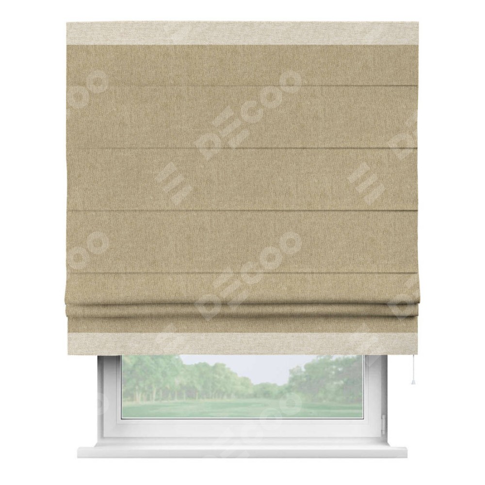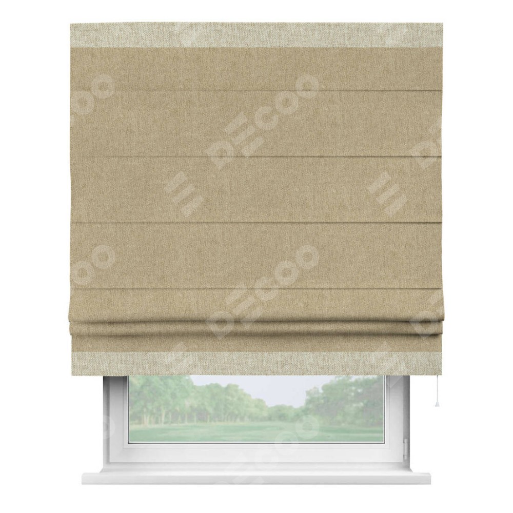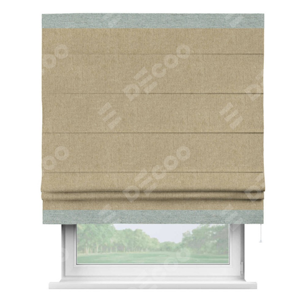 Римская штора производителя «Cortin», используется для проёма, пошита из ткани стиф димаут бежевый, артикул 18083. Отделка шторы кантом «Горизонт», ткань для канта используется из стифа разной расцветки на выбор. Имеет универсальный механизм и подходит для монтажа: на потолок, на стену и в нишу.