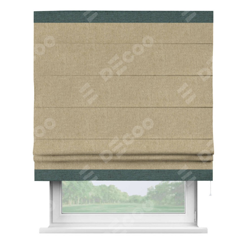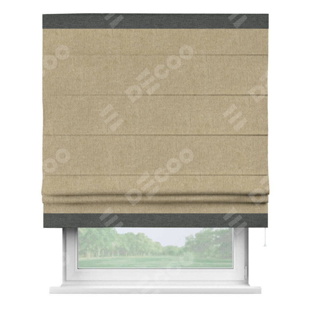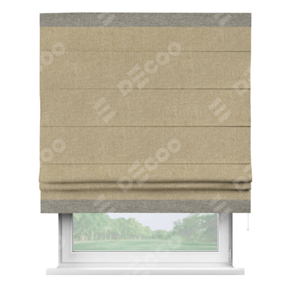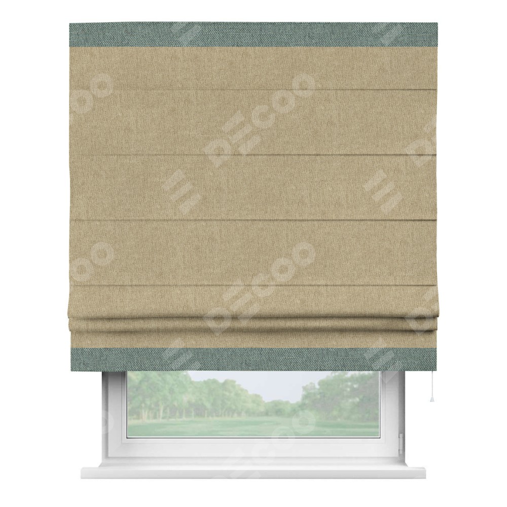 Римская штора производителя «Cortin», используется для проёма, пошита из ткани стиф димаут бежевый, артикул 18083. Отделка шторы кантом «Горизонт», ткань для канта используется из стифа разной расцветки на выбор. Имеет универсальный механизм и подходит для монтажа: на потолок, на стену и в нишу.