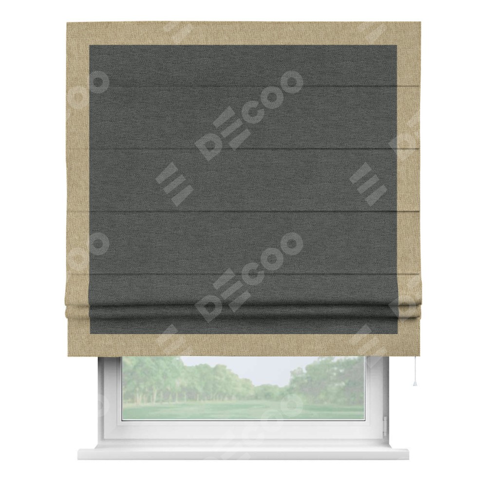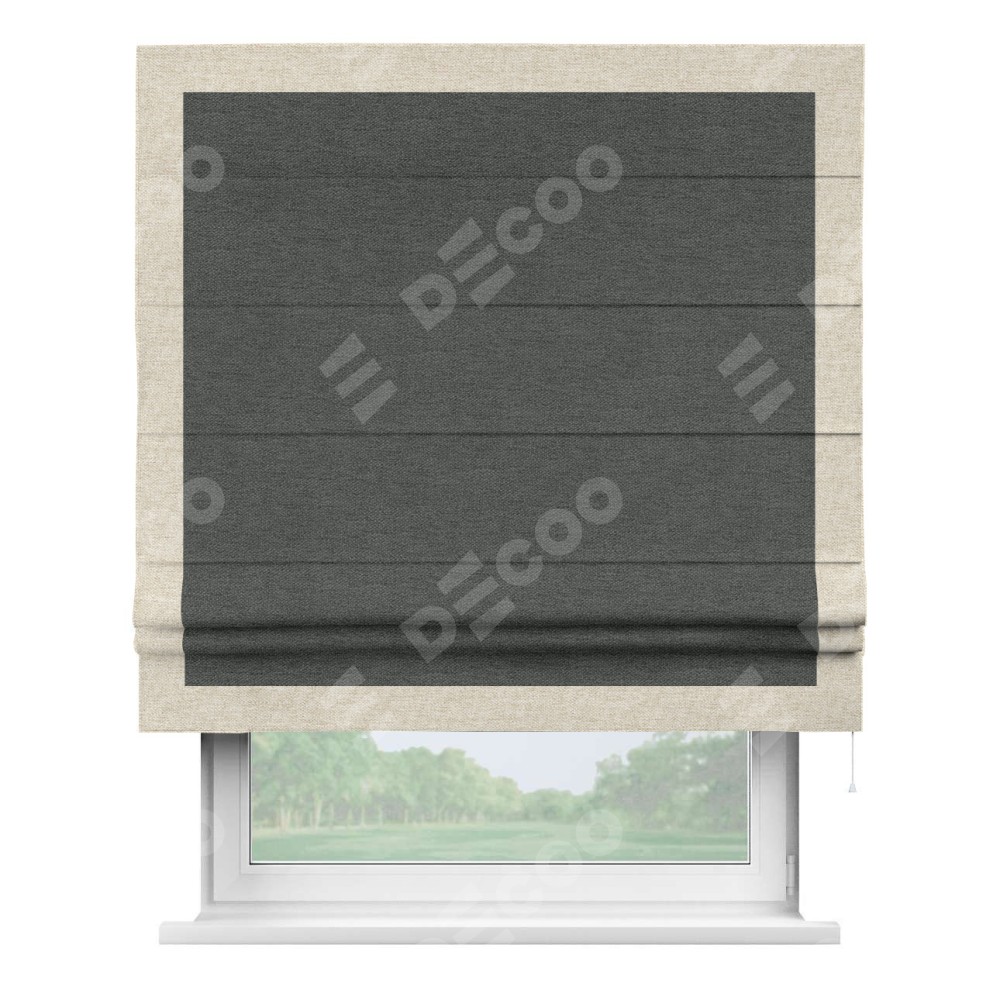 Римская штора производителя «Cortin», используется для проёма, пошита из ткани стиф димаут графит, артикул 44026. Отделка шторы кантом «Чесс», ткань для канта используется из стифа разной расцветки на выбор. Имеет универсальный механизм и подходит для монтажа: на потолок, на стену и в нишу.