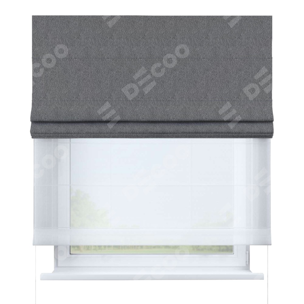 Римская штора день-ночь производителя «Cortin», используется для проёма, пошита из двух полотен, с лицевой стороны софт однотонный серый артикул 70605, вторая ткань тюль (по стандарту комплектуется тюль белого цвета артикул V-01). Имеет универсальный механизм и подходит для монтажа: на потолок, на стену и в нишу.