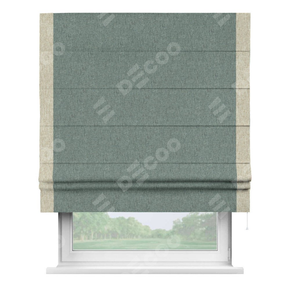 Римская штора производителя «Cortin», используется для проёма, пошита из ткани стиф димаут серо-голубой, артикул 44029. Отделка шторы кантом «Стрим Дуо», ткань для канта используется из стифа разной расцветки на выбор. Имеет универсальный механизм и подходит для монтажа: на потолок, на стену и в нишу.
