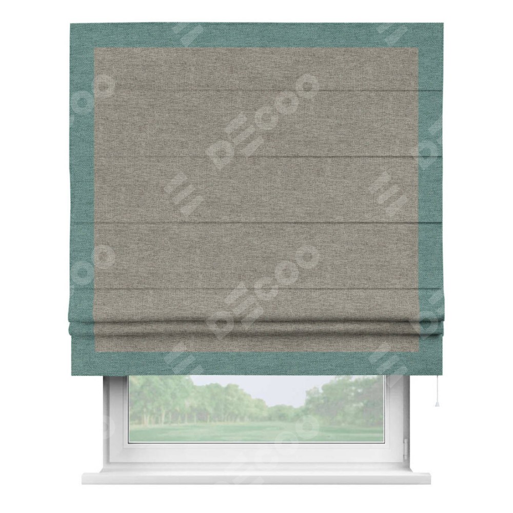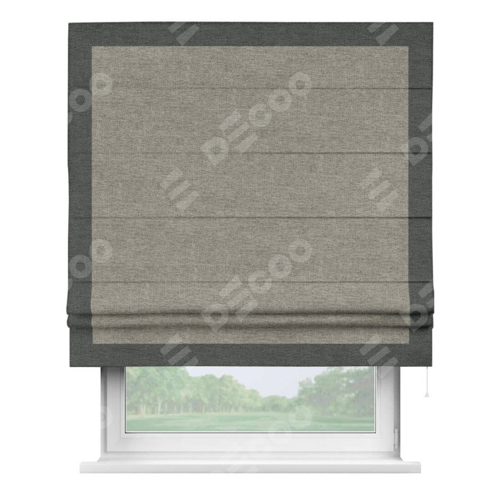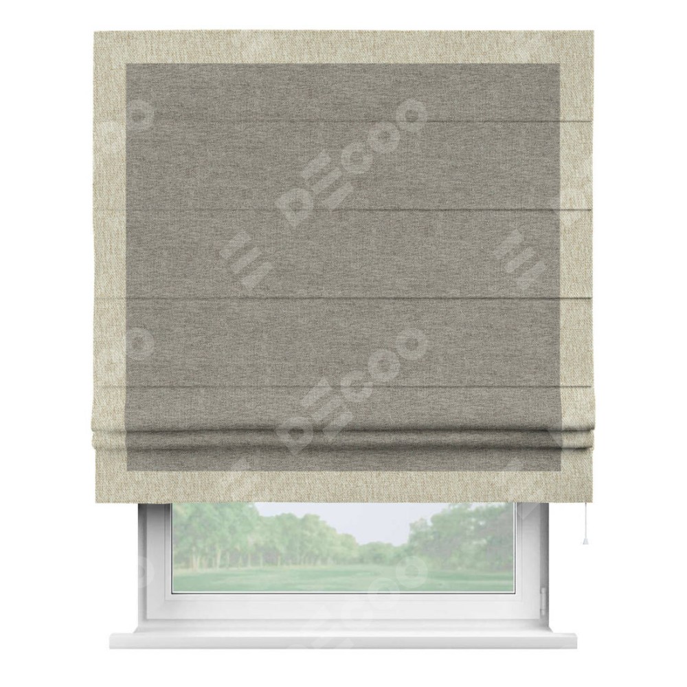 Римская штора производителя «Cortin», используется для проёма, пошита из ткани стиф димаут серо-коричневый, артикул 44028. Отделка шторы кантом «Чесс», ткань для канта используется из стифа разной расцветки на выбор. Имеет универсальный механизм и подходит для монтажа: на потолок, на стену и в нишу.