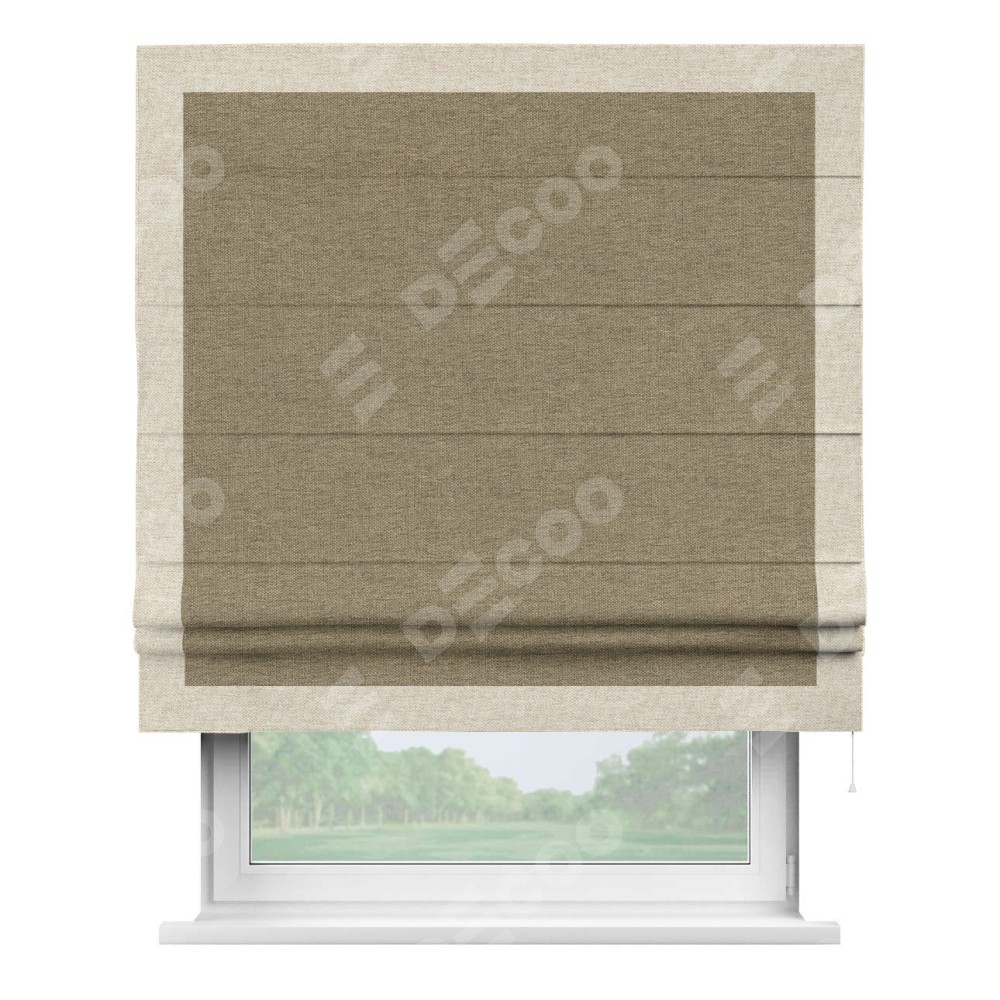 Римская штора производителя «Cortin», используется для проёма, пошита из ткани стиф димаут тёмно-бежевый, артикул 18085. Отделка шторы кантом «Чесс», ткань для канта используется из стифа разной расцветки на выбор. Имеет универсальный механизм и подходит для монтажа: на потолок, на стену и в нишу.