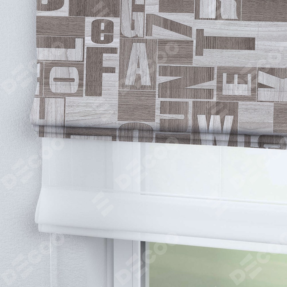 Римская штора день-ночь производителя «Cortin», используется для проёма, пошита из двух полотен, с лицевой блэкаут с нанесением сублимационной печати «Литеры лофт», вторая ткань тюль (по стандарту комплектуется тюль белого цвета артикул V-01). Имеет универсальный механизм и подходит для монтажа: на потолок, на стену и в нишу.