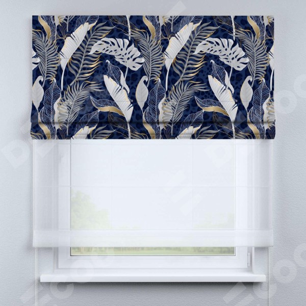 Римская штора день-ночь производителя «Cortin», используется для проёма, пошита из двух полотен, с лицевой блэкаут с нанесением сублимационной печати «Сине-золотые джунгли», вторая ткань тюль (по стандарту комплектуется тюль белого цвета артикул V-01). Имеет универсальный механизм и подходит для монтажа: на потолок, на стену и в нишу.