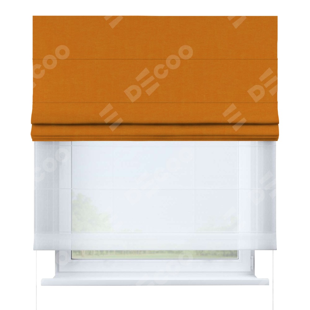 Римская штора день-ночь производителя «Cortin», используется для проёма, пошита из двух полотен, с лицевой стороны канвас оранжевый артикул v-106, вторая ткань тюль (по стандарту комплектуется тюль белого цвета артикул V-01). Имеет универсальный механизм и подходит для монтажа: на потолок, на стену и в нишу.