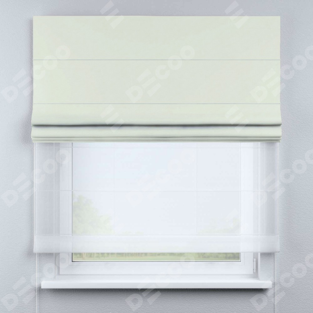 Римская штора день-ночь производителя «Cortin», используется для проёма, пошита из двух полотен, с лицевой стороны канвас сливочный артикул v-94, вторая ткань тюль (по стандарту комплектуется тюль белого цвета артикул V-01). Имеет универсальный механизм и подходит для монтажа: на потолок, на стену и в нишу.