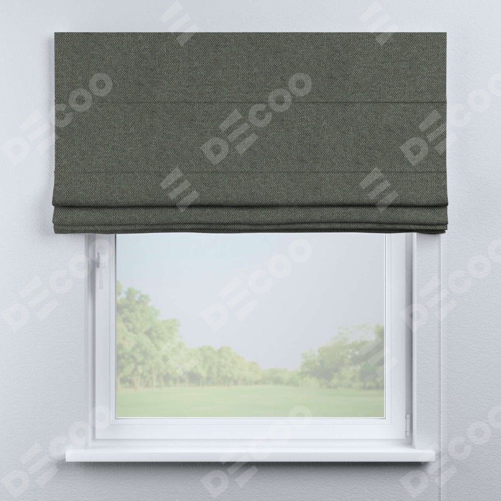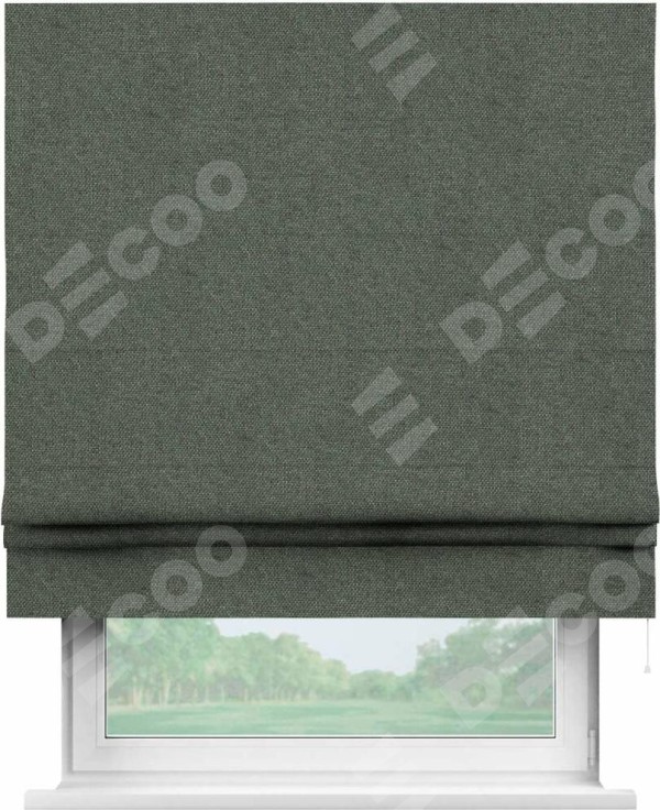 Римская штора производителя «Cortin», используется для проёма, пошита из ткани лён димаут тёмно-серый, артикул ткани 91011. Имеет универсальный механизм и подходит для монтажа: на потолок, на стену и в нишу.