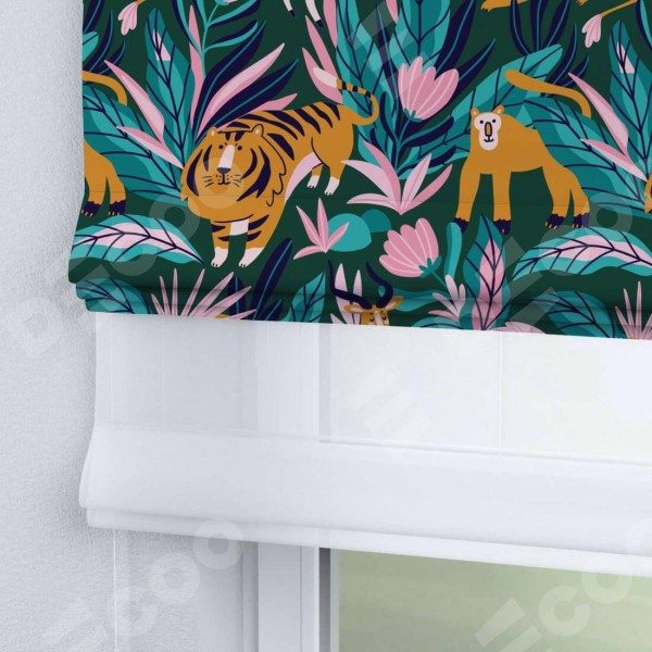Римская штора день-ночь производителя «Cortin», используется для проёма, пошита из двух полотен, с лицевой блэкаут с нанесением сублимационной печати «Дикие животные», вторая ткань тюль (по стандарту комплектуется тюль белого цвета артикул V-01). Имеет универсальный механизм и подходит для монтажа: на потолок, на стену и в нишу.