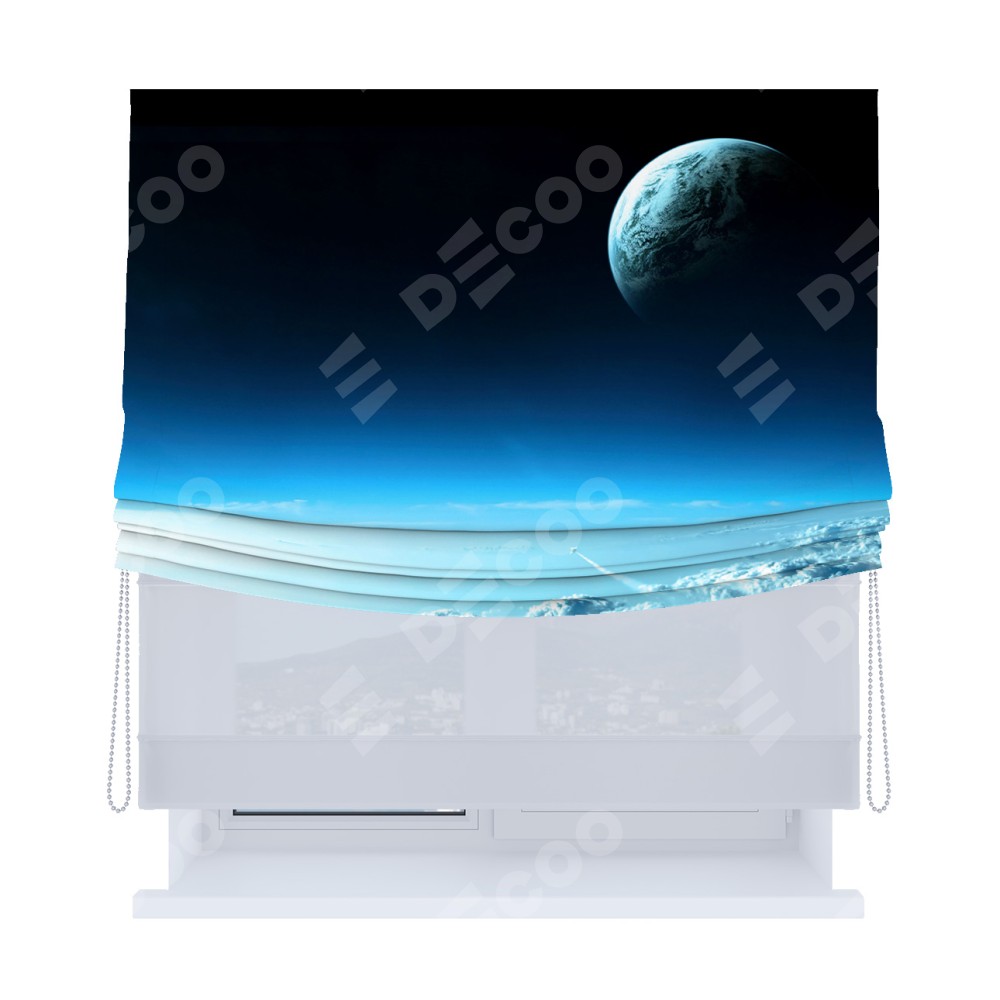 Римская штора день-ночь производителя «Cortin», используется для проёма, пошита из двух полотен, с лицевой блэкаут с нанесением сублимационной печати «Горизонты вселенной», вторая ткань тюль (по стандарту комплектуется тюль белого цвета артикул V-01). Имеет универсальный механизм и подходит для монтажа: на потолок, на стену и в нишу. Удобное управление каждой шторой отдельно.