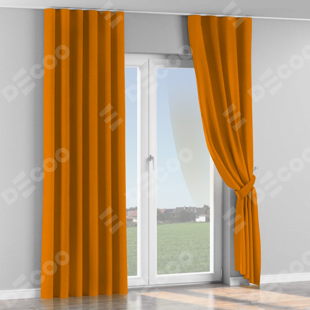 Комплект прямых штор, от производителя «Cortin», пошиты из ткани канвас оранжевый, артикул ткани v-106. С изнаночной стороны в верхней части штор пристрачивается шторная лента с декоративными складками «Волна». Для создания элегантных складок прямые шторы шьются по стандарту с коэффициентом 1:2 (на 100 см. ширины проёма 200 см. ширины ткани).