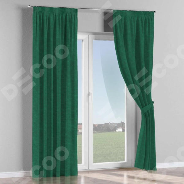 Комплект прямых штор, от производителя «Cortin», пошиты из ткани канвас тёмно-зелёный, артикул ткани v-469. С изнаночной стороны в верхней части штор пристрачивается шторная лента с декоративными складками «Карандаш». Для создания элегантных складок прямые шторы шьются по стандарту с коэффициентом 1:2 (на 100 см. ширины проёма 200 см. ширины ткани).