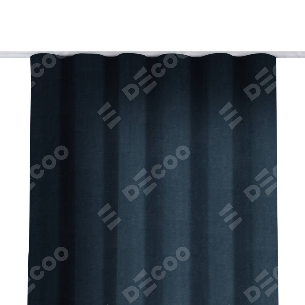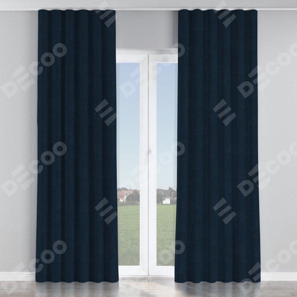 Комплект прямых штор, от производителя «Cortin», пошиты из ткани канвас тёмно-синий, артикул ткани v-206. С изнаночной стороны в верхней части штор пристрачивается шторная лента с декоративными складками «Волна». Для создания элегантных складок прямые шторы шьются по стандарту с коэффициентом 1:2 (на 100 см. ширины проёма 200 см. ширины ткани).