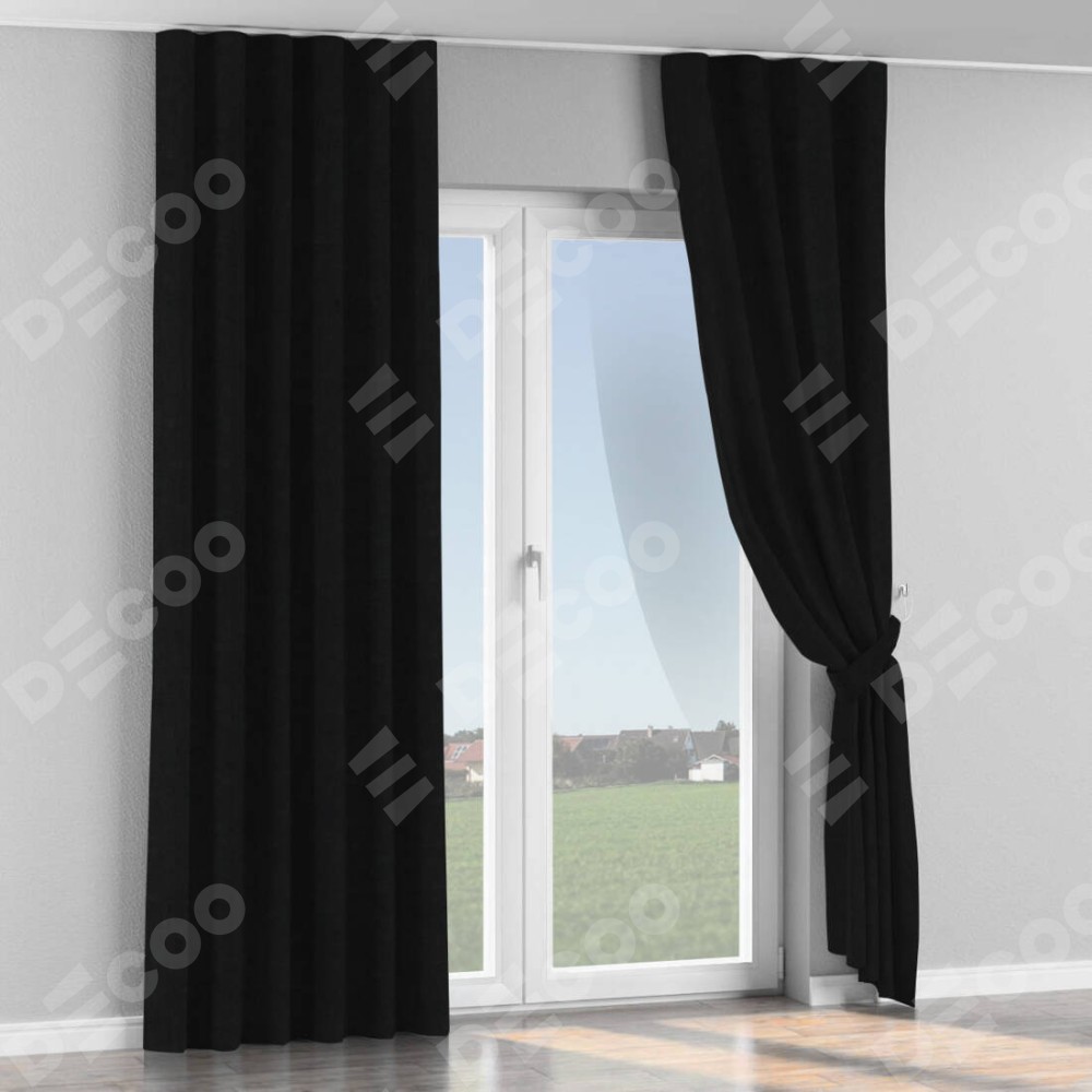Комплект прямых штор, от производителя «Cortin», пошиты из ткани канвас черный, артикул ткани v-194. С изнаночной стороны в верхней части штор пристрачивается шторная лента с декоративными складками «Волна». Для создания элегантных складок прямые шторы шьются по стандарту с коэффициентом 1:2 (на 100 см. ширины проёма 200 см. ширины ткани).