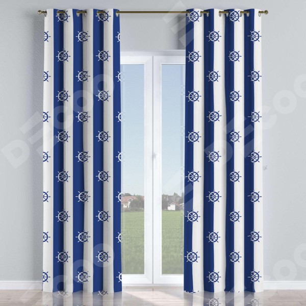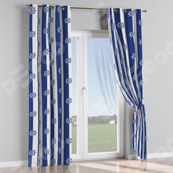 Комплект прямых штор, от производителя «Cortin», пошиты из ткани блэкаут с нанесением сублимационной печати «Полоски и штурвалы». Данная модель пошита на люверсах, комплектуется на выбор круглым карнизом и подходит для монтажа на стену или потолок. Прямые шторы на люверсах шьются по стандарту с коэффициентом 1/2 (на 100 см. ширины проёма 200 см. ширины ткани), отличительным преимуществом данной модели является простой способ монтажа. Достаточно повесить ее на трубу и штора готова!