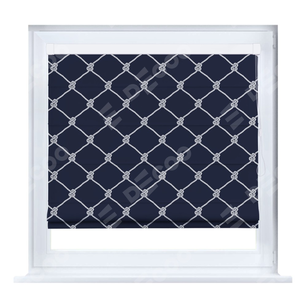 Римская штора кассетного типа, производителя «Cortin», устанавливается только на пластиковые окна и прилегает к стеклопакету, пошита из ткани блэкаут с нанесением сублимационной печати «Морские веревки».