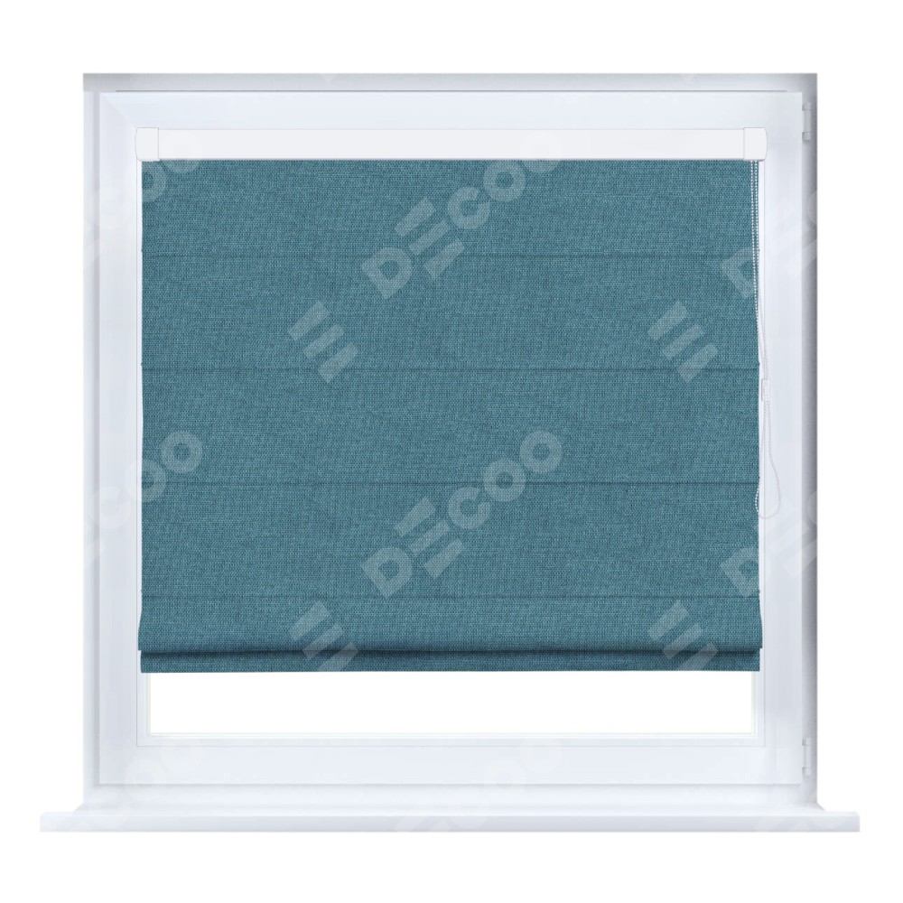 Римская штора производителя «Cortin», устанавливается на створку окна, пошита из ткани лён димаут светло-синий, артикул 91007. Штора шьётся по индивидуальным размерам, для данного типа римской шторы возможная ширина от 35 до 150 см., высота до 250 см.
