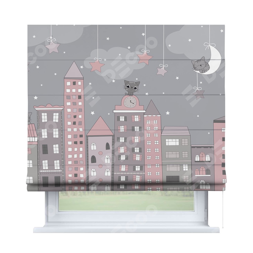 Римская штора производителя «Cortin», используется для проёма, пошита из ткани блэкаут с нанесением сублимационной печати «Вечерний город». Имеет универсальный механизм и подходит для монтажа: на потолок, на стену и в нишу.