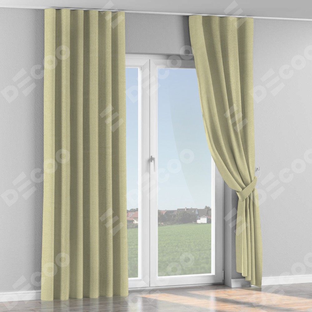 Комплект прямых штор, от производителя «Cortin», пошиты из ткани лён димаут шампань, артикул ткани 90994. С изнаночной стороны в верхней части штор пристрачивается шторная лента с декоративными складками «Волна». Для создания элегантных складок прямые шторы шьются по стандарту с коэффициентом 1:2 (на 100 см. ширины проёма 200 см. ширины ткани).