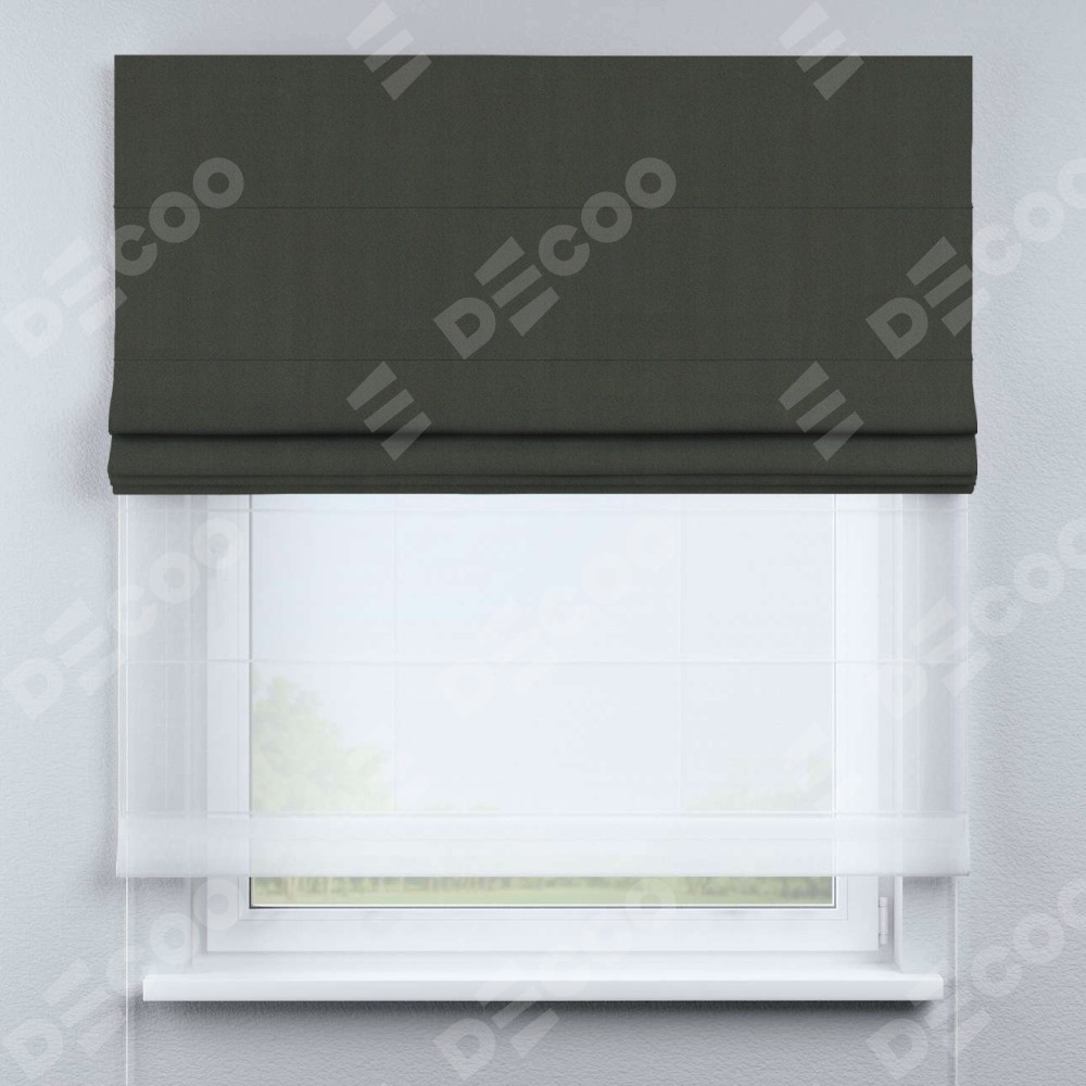 Двойная римская штора «День-ночь» от производителя Cortin предназначена для использования в проёмах. Эта штора уникальна тем, что состоит из двух полотен. На лицевой стороне находится однотонный дымчато-серый блэкаут (артикул: 91571−1), обеспечивающий эффективное затемнение. В комплект также входит вторая ткань — легкий белый тюль (артикул: V-01), который добавляет изящества и легкости оформлению окна. Кроме того, доступны и другие разновидности ткани тюль, выбор которых доступен по  ссылке .