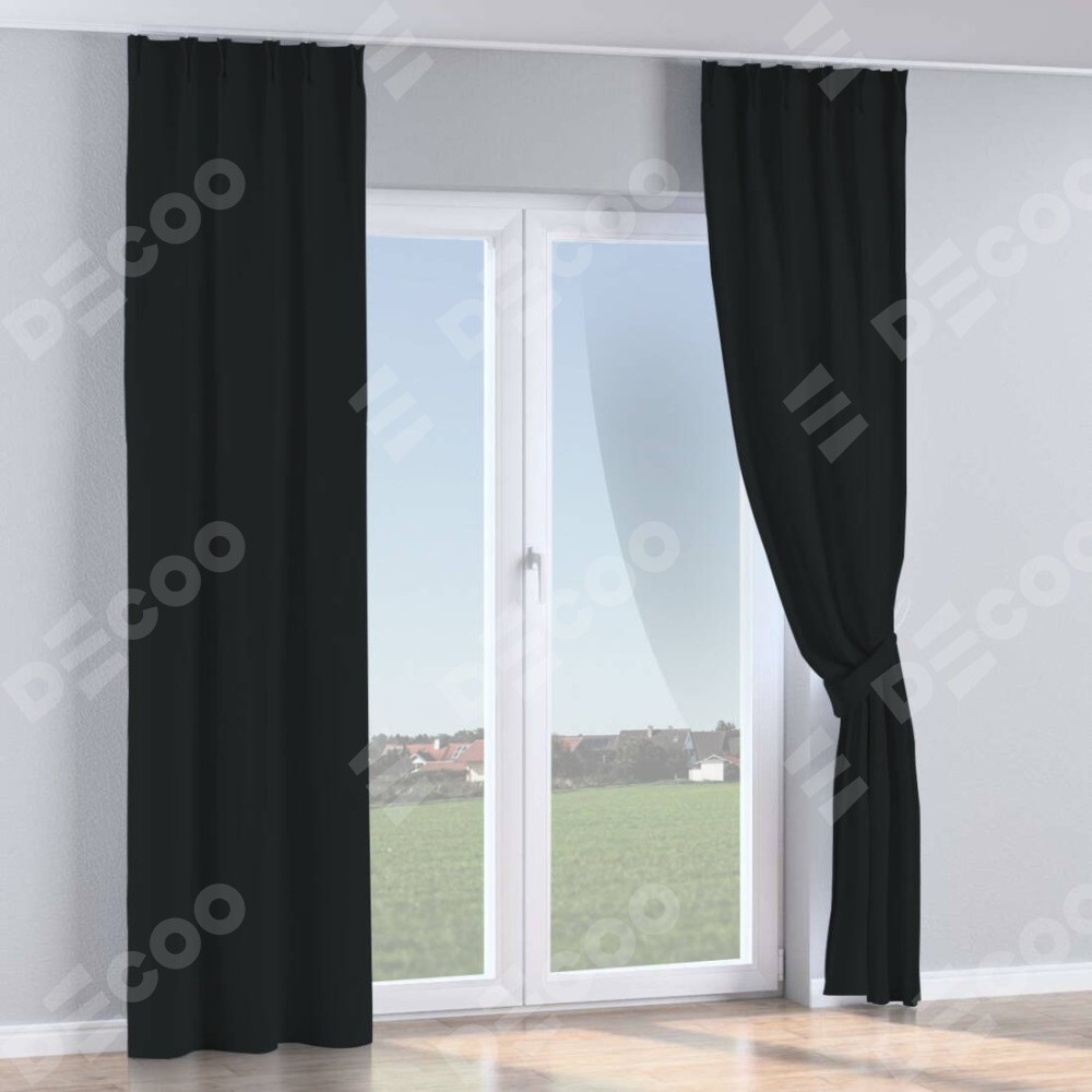 Комплект прямых штор, от производителя «Cortin», пошиты из ткани блэкаут однотонный черный, артикул ткани 91571−2. С изнаночной стороны в верхней части штор пристрачивается шторная лента с декоративными складками «Кустик». Для создания элегантных складок прямые шторы шьются по стандарту с коэффициентом 1:2 (на 100 см. ширины проёма 200 см. ширины ткани).