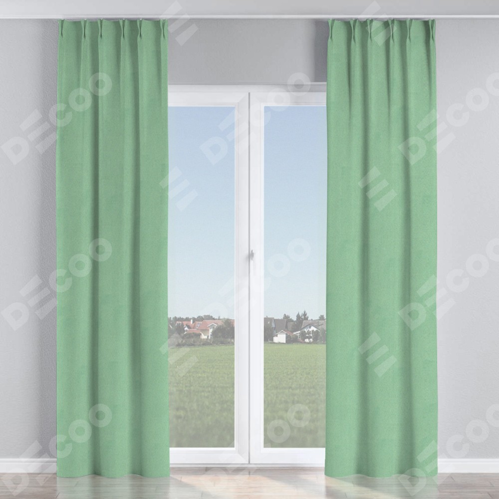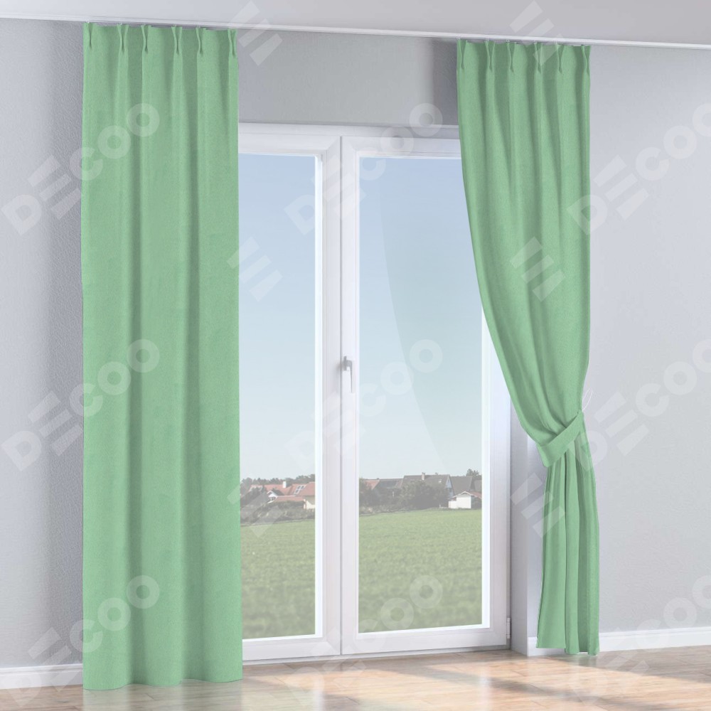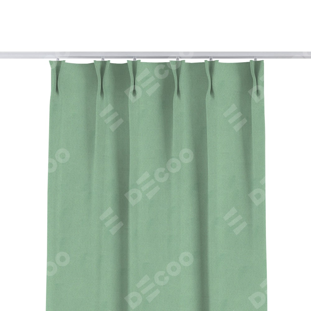 Комплект прямых штор, от производителя «Cortin», пошиты из ткани блэкаут однотонный ментоловый, артикул ткани 91572−1. С изнаночной стороны в верхней части штор пристрачивается шторная лента с декоративными складками «Кустик». Для создания элегантных складок прямые шторы шьются по стандарту с коэффициентом 1:2 (на 100 см. ширины проёма 200 см. ширины ткани).