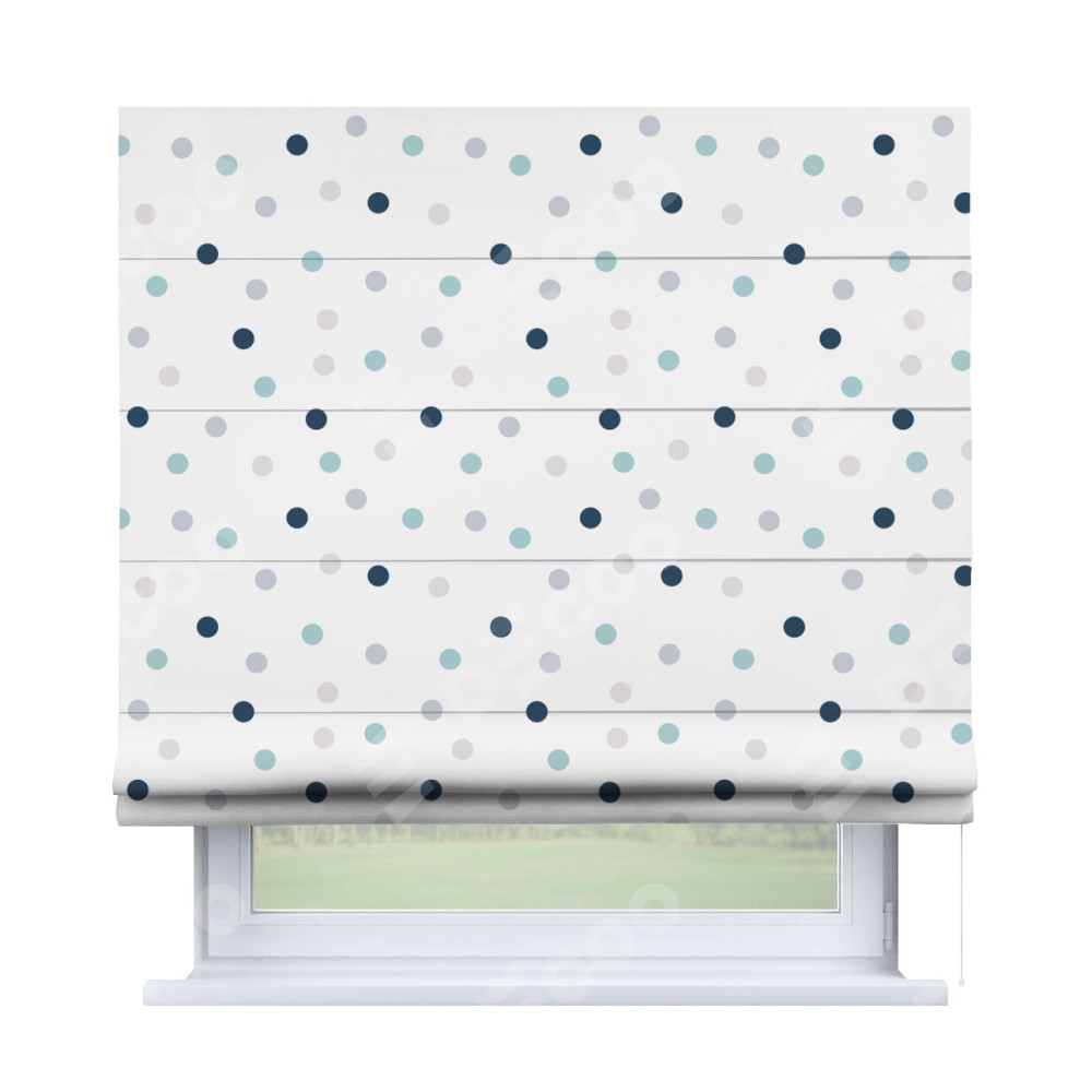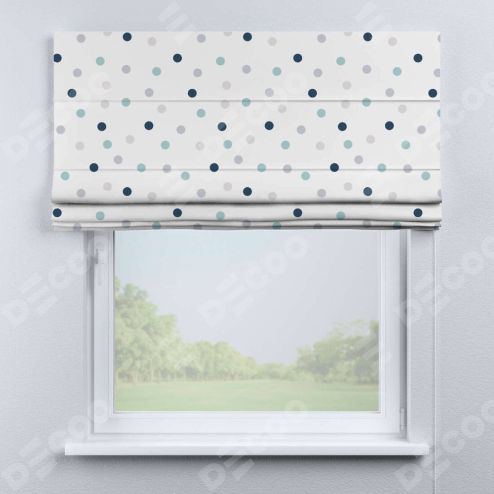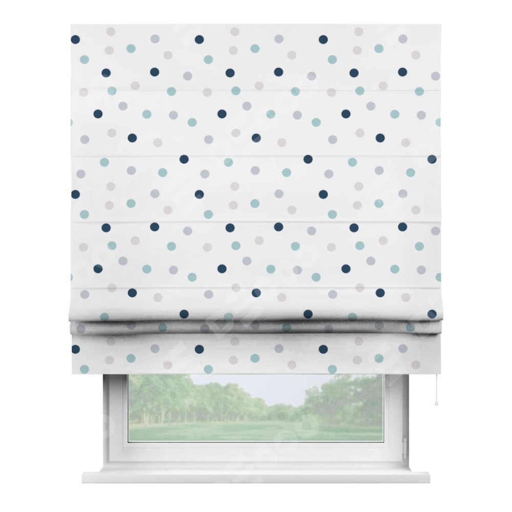 Римская штора производителя «Cortin», используется для проёма, пошита из ткани блэкаут с нанесением сублимационной печати «Точки». Имеет универсальный механизм и подходит для монтажа: на потолок, на стену и в нишу.