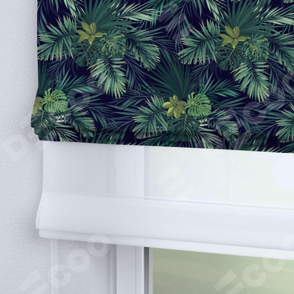 Римская штора день-ночь производителя «Cortin», используется для проёма, пошита из двух полотен, с лицевой блэкаут с нанесением сублимационной печати «Пальмовые листья», вторая ткань тюль (по стандарту комплектуется тюль белого цвета артикул V-01). Имеет универсальный механизм и подходит для монтажа: на потолок, на стену и в нишу.