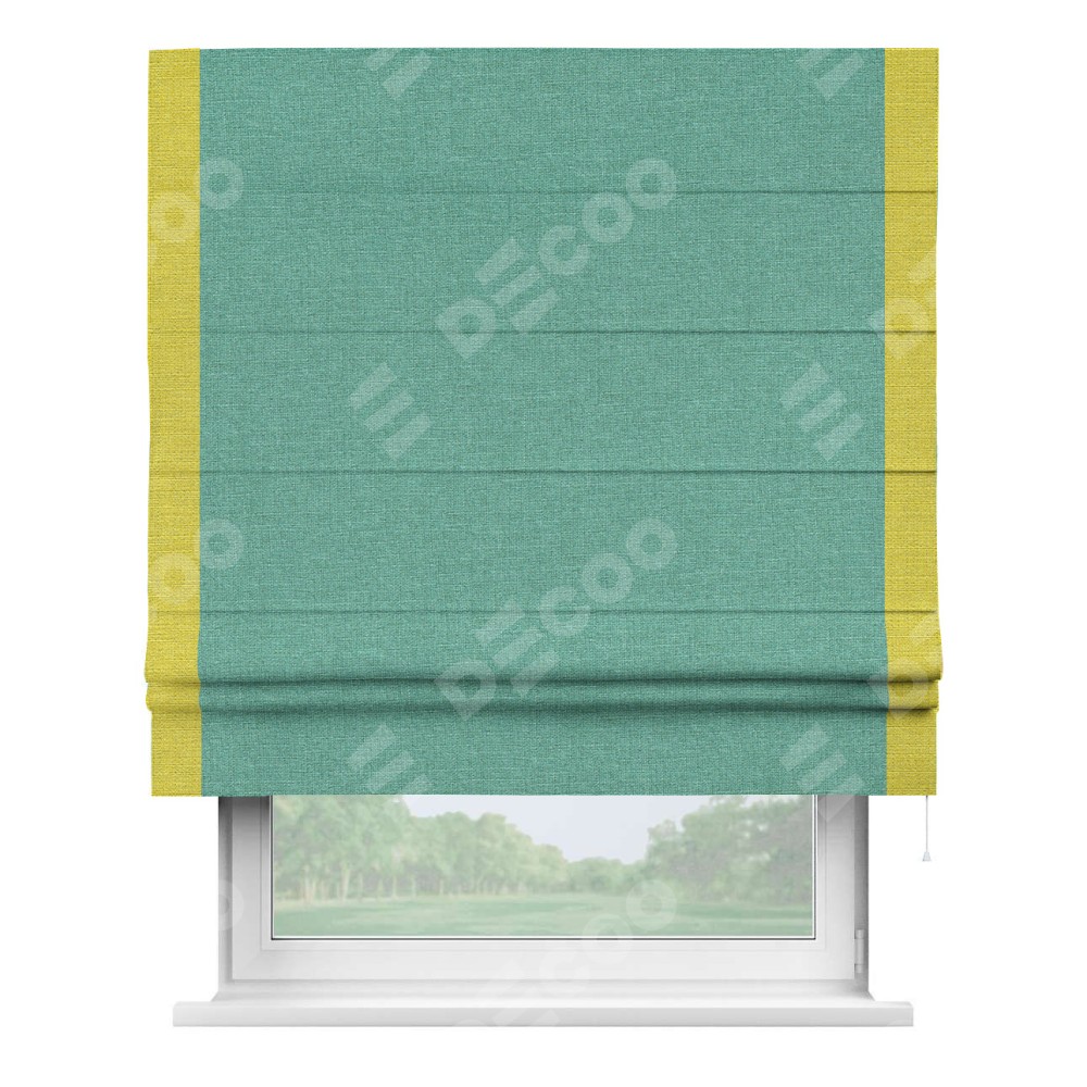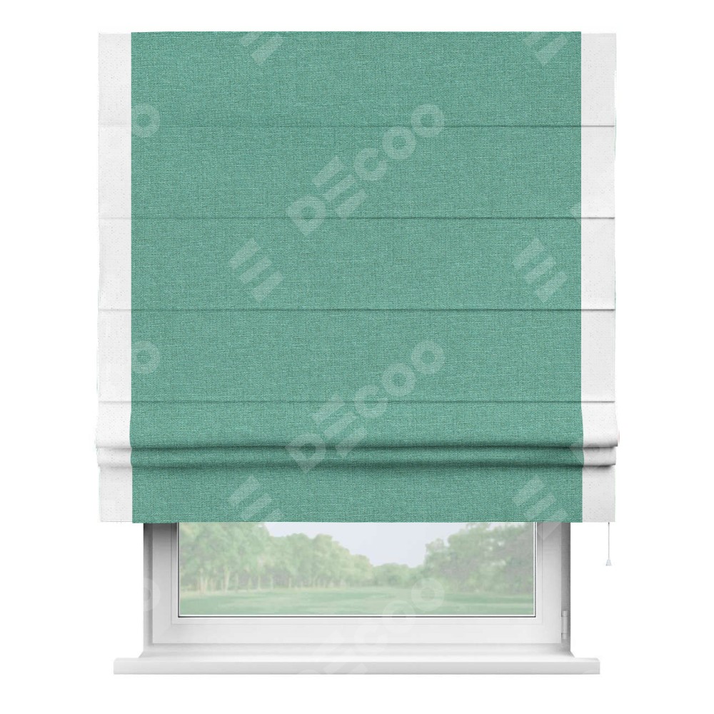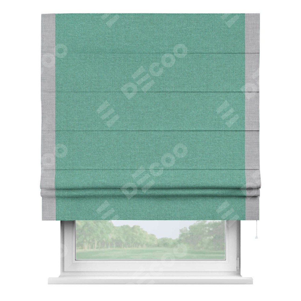 Римская штора производителя «Cortin», используется для проёма, пошита из ткани лён светло-бирюзовый, артикул 53435. Отделка шторы кантом «Стрим Дуо», ткань для канта используется из льна разной расцветки на выбор. Имеет универсальный механизм и подходит для монтажа: на потолок, на стену и в нишу.
