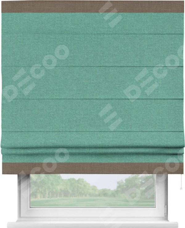 Римская штора производителя «Cortin», используется для проёма, пошита из ткани лён светло-бирюзовый, артикул 53435. Отделка шторы кантом «Горизонт», ткань для канта используется из льна разной расцветки на выбор. Имеет универсальный механизм и подходит для монтажа: на потолок, на стену и в нишу.