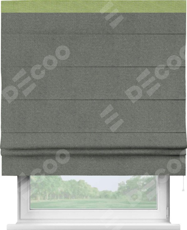 Римская штора производителя «Cortin», используется для проёма, пошита из ткани лён димаут тёмно-серый, артикул 91011. Отделка шторы кантом «Кинг», ткань для канта используется из льна димаут разной расцветки на выбор. Имеет универсальный механизм и подходит для монтажа: на потолок, на стену и в нишу.