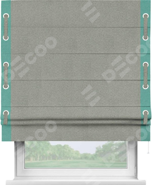 Римская штора производителя «Cortin», используется для проёма, пошита из ткани лён димаут серый, артикул 91009. Отделка шторы кантом «Стрим Дуо» на кантах расположены люверсы с пояском, ткань для канта используется лён димаут разной расцветки на выбор. Ткань для пояска обычно используется из основной ткани шторы, а так же можно сделать из любой расцветки по желанию. Имеет универсальный механизм и подходит для монтажа: на потолок, на стену и в нишу.