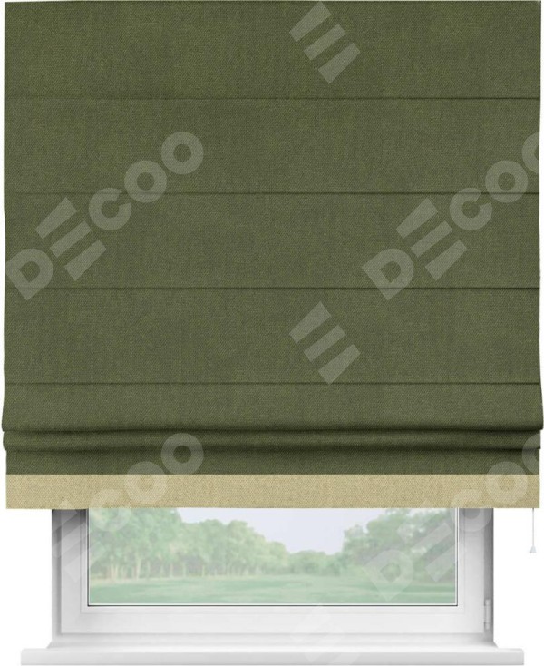 Римская штора производителя «Cortin», используется для проёма, пошита из ткани лён димаут салатовый, артикул 91002. Отделка шторы кантом «Джестер», ткань для канта используется из льна димаут разной расцветки на выбор. Имеет универсальный механизм и подходит для монтажа: на потолок, на стену и в нишу.