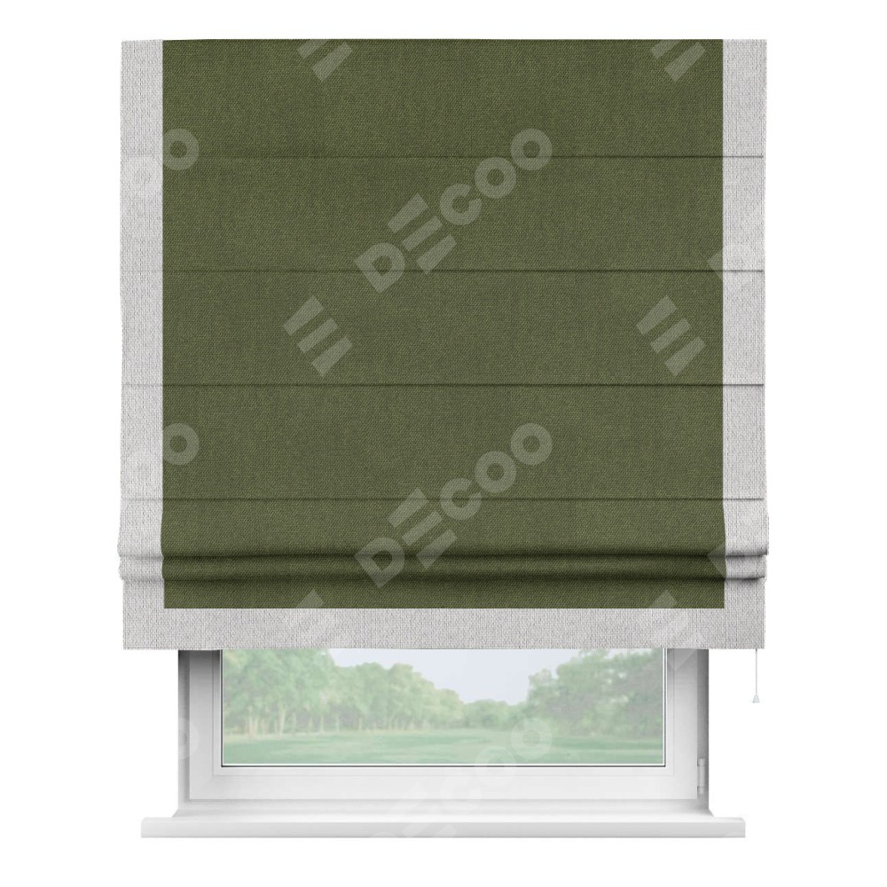 Римская штора производителя «Cortin», используется для проёма, пошита из ткани лён димаут салатовый, артикул 91002. Отделка шторы кантом «Виктория», ткань для канта используется из льна димаут разной расцветки на выбор. Имеет универсальный механизм и подходит для монтажа: на потолок, на стену и в нишу.