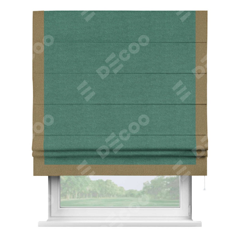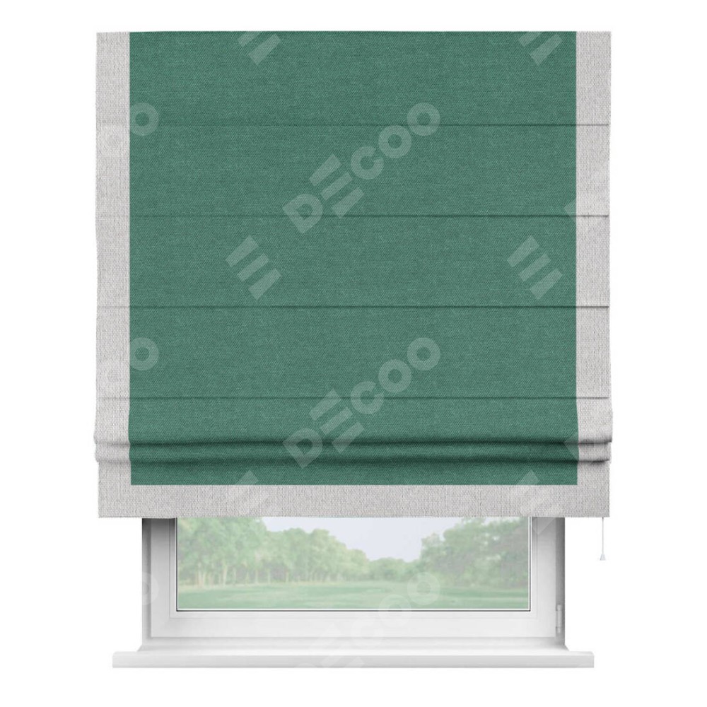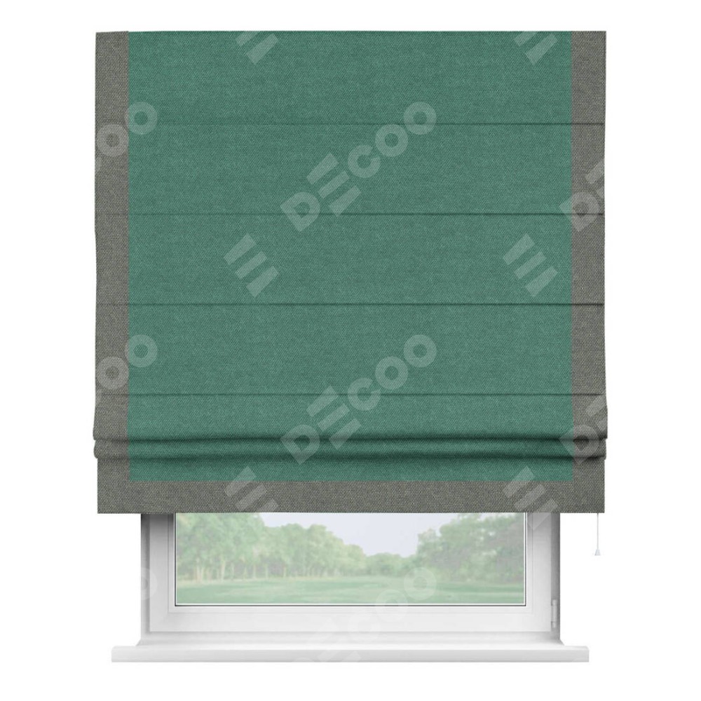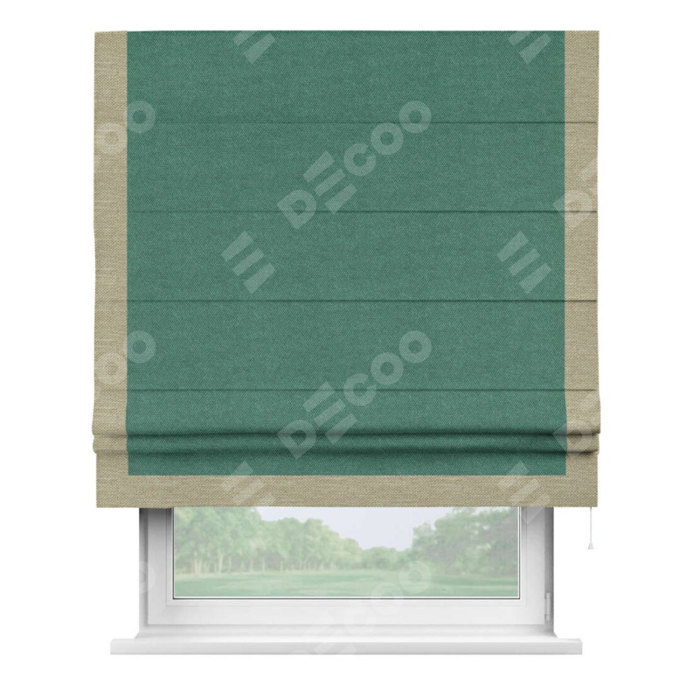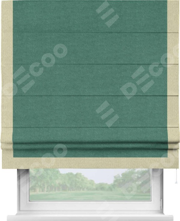 Римская штора производителя «Cortin», используется для проёма, пошита из ткани лён димаут светло-бирюзовый, артикул 91005. Отделка шторы кантом «Виктория», ткань для канта используется из льна димаут разной расцветки на выбор. Имеет универсальный механизм и подходит для монтажа: на потолок, на стену и в нишу.