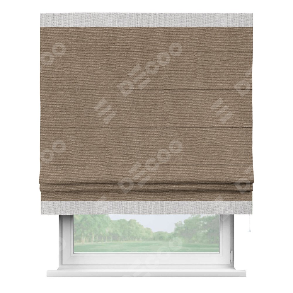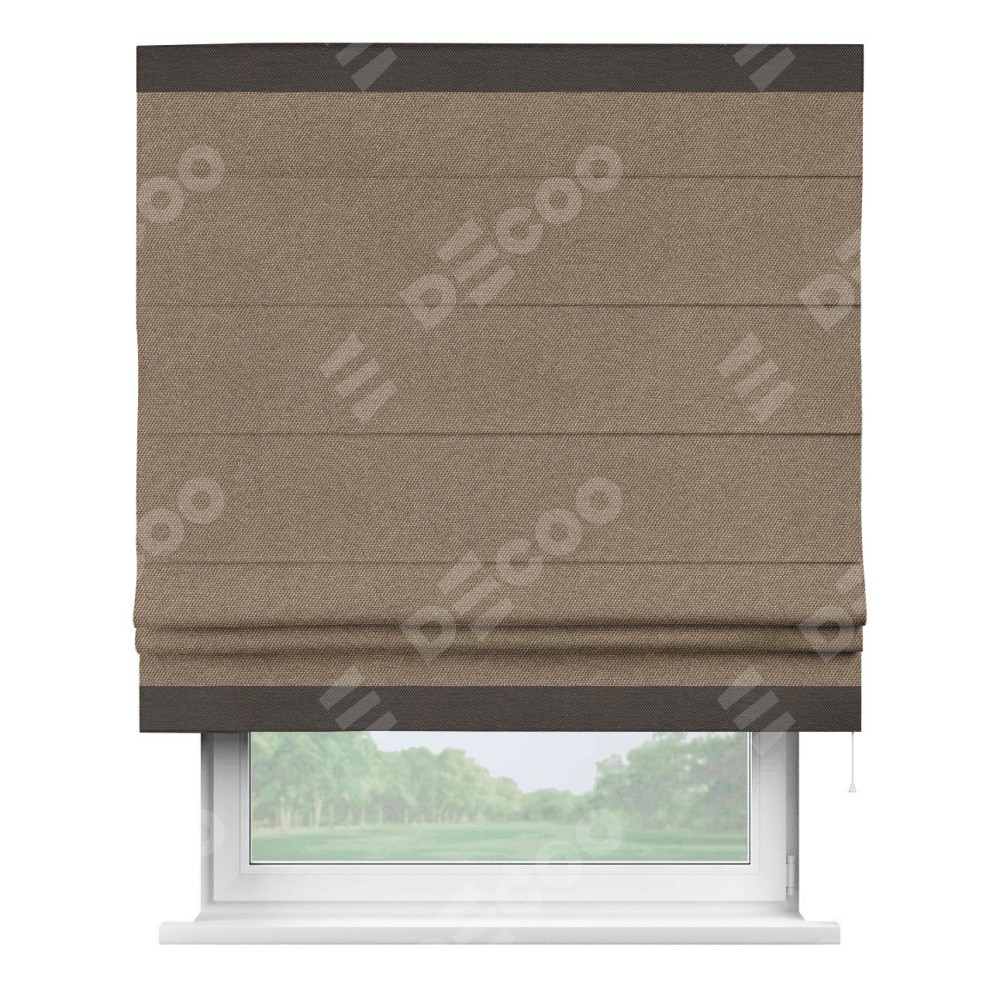 Римская штора производителя «Cortin», используется для проёма, пошита из ткани лён димаут коричневый, артикул 90996. Отделка шторы кантом «Горизонт», ткань для канта используется из льна димаут разной расцветки на выбор. Имеет универсальный механизм и подходит для монтажа: на потолок, на стену и в нишу.
