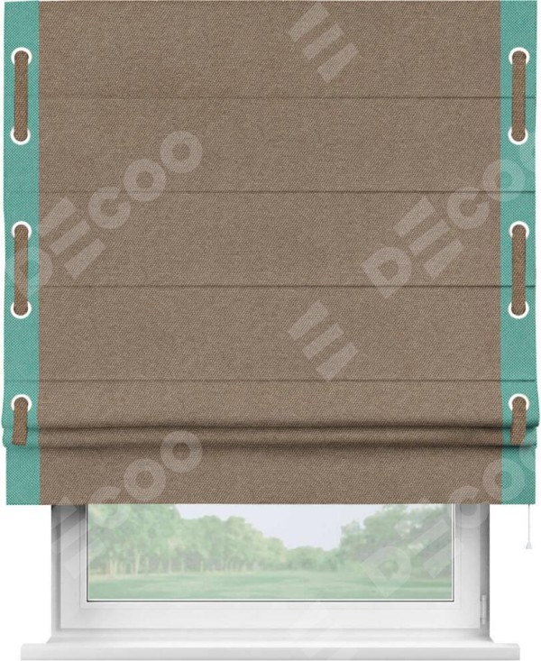 Римская штора «Кортин» для проема, лён димаут коричневый с кантом Стрим Дуо (люверсы с пояском)