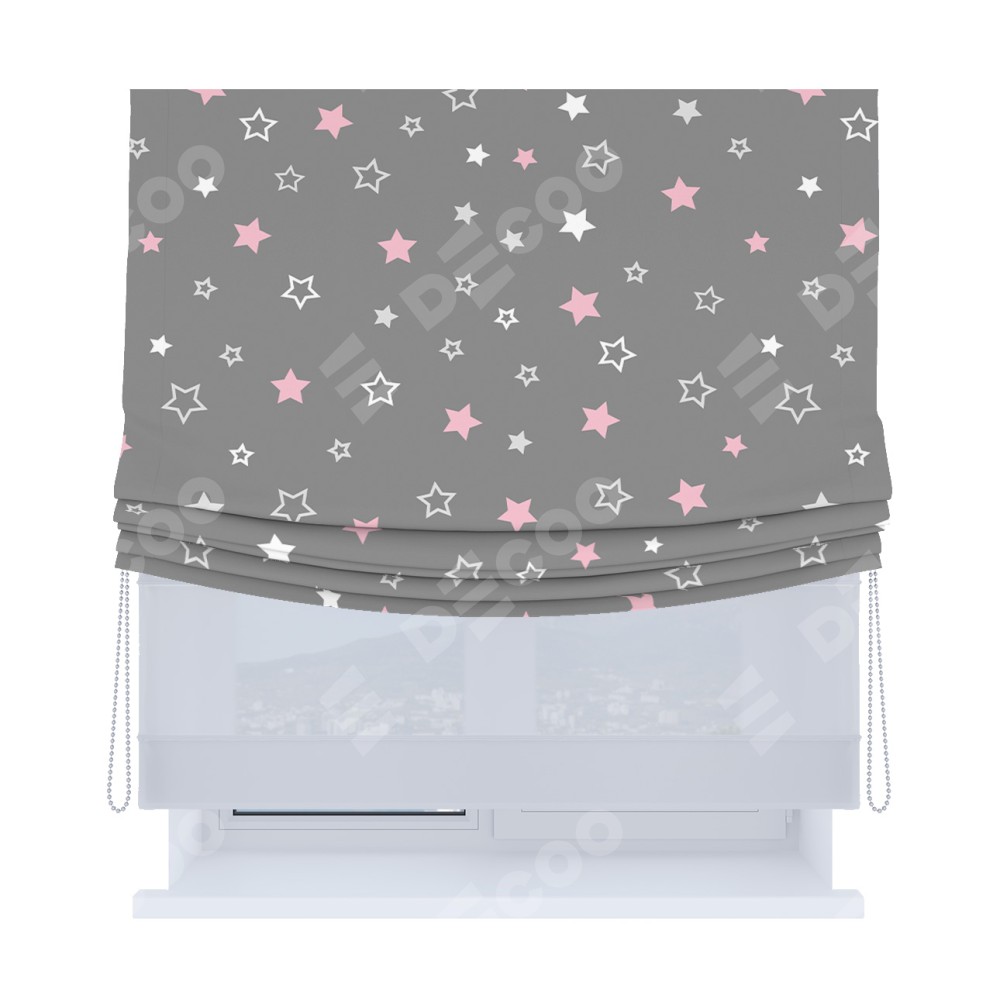 Римская штора день-ночь производителя «Cortin», используется для проёма, пошита из двух полотен, с лицевой блэкаут с нанесением сублимационной печати «Розовый звездопад», вторая ткань тюль (по стандарту комплектуется тюль белого цвета артикул V-01). Имеет универсальный механизм и подходит для монтажа: на потолок, на стену и в нишу. Удобное управление каждой шторой отдельно.