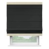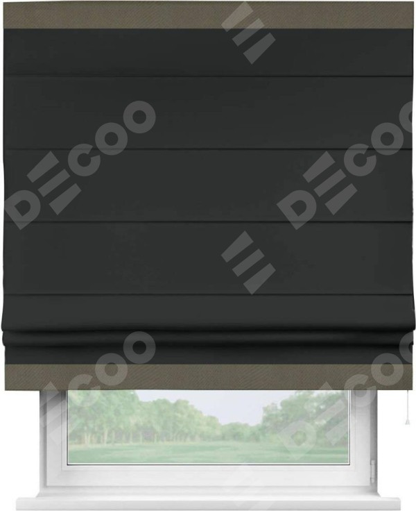 Римская штора производителя «Cortin», используется для проёма, пошита из ткани блэкаут однотонный черный, артикул ткани 91571−2. Отделка шторы кантом «Горизонт», ткань для канта используется из блэкаута однотонного разной расцветки на выбор. Имеет универсальный механизм и подходит для монтажа: на потолок, на стену и в нишу.