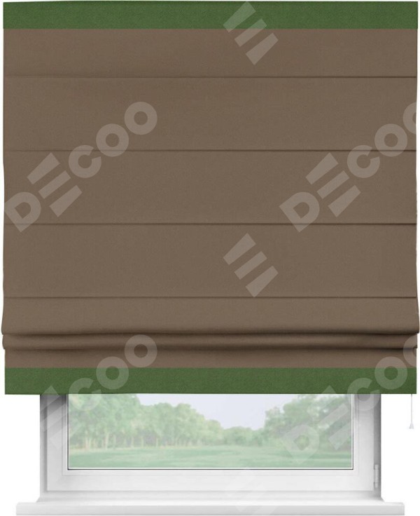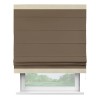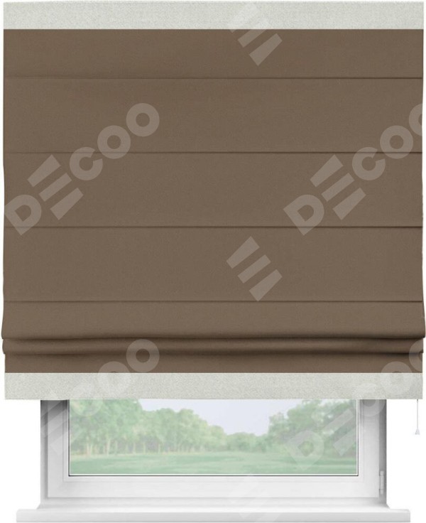 Римская штора производителя «Cortin», используется для проёма, пошита из ткани блэкаут однотонный коричневый, артикул ткани 91334. Отделка шторы кантом «Горизонт», ткань для канта используется из блэкаута однотонного разной расцветки на выбор. Имеет универсальный механизм и подходит для монтажа: на потолок, на стену и в нишу.