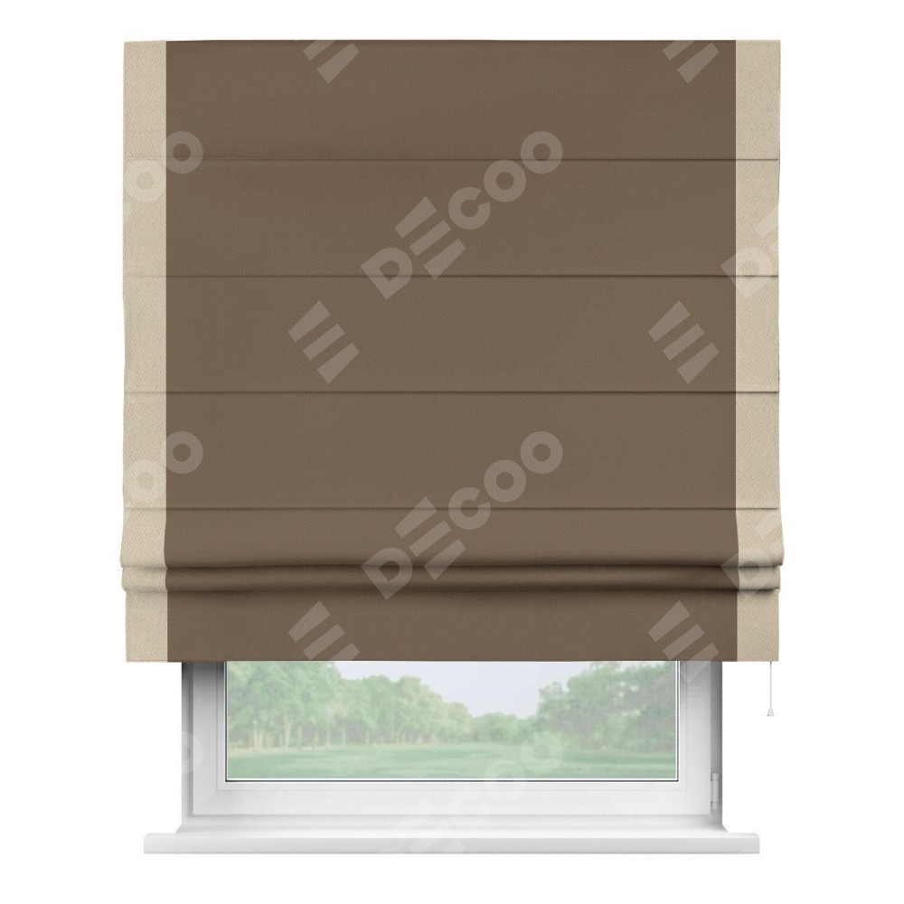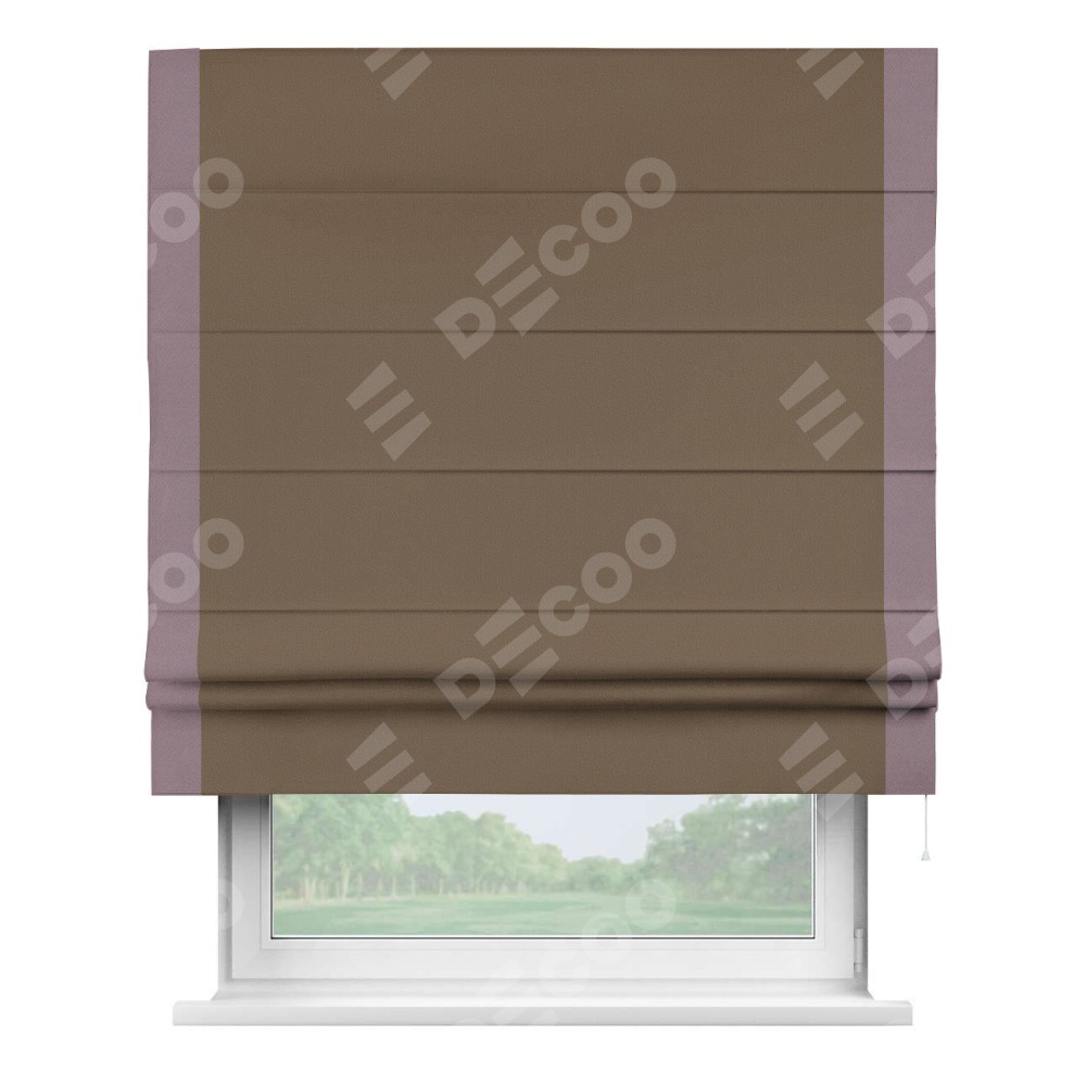 Римская штора производителя «Cortin», используется для проёма, пошита из ткани блэкаут однотонный коричневый, артикул ткани 91334. Отделка шторы кантом «Стрим Дуо», ткань для канта используется из блэкаута однотонного разной расцветки на выбор. Имеет универсальный механизм и подходит для монтажа: на потолок, на стену и в нишу.